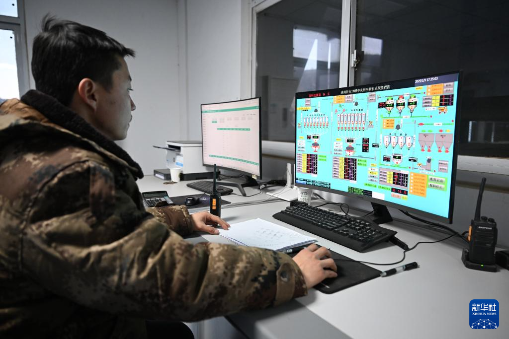 1月9日,在位于陕西省榆林市清涧县的陕西外经贸国际农业合作有限公司黑牛养殖基地,工作人员在中央厨房中控室监测饲料配比投放情况。