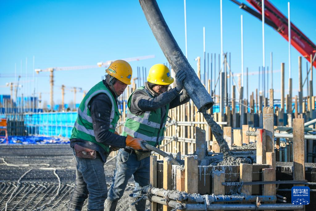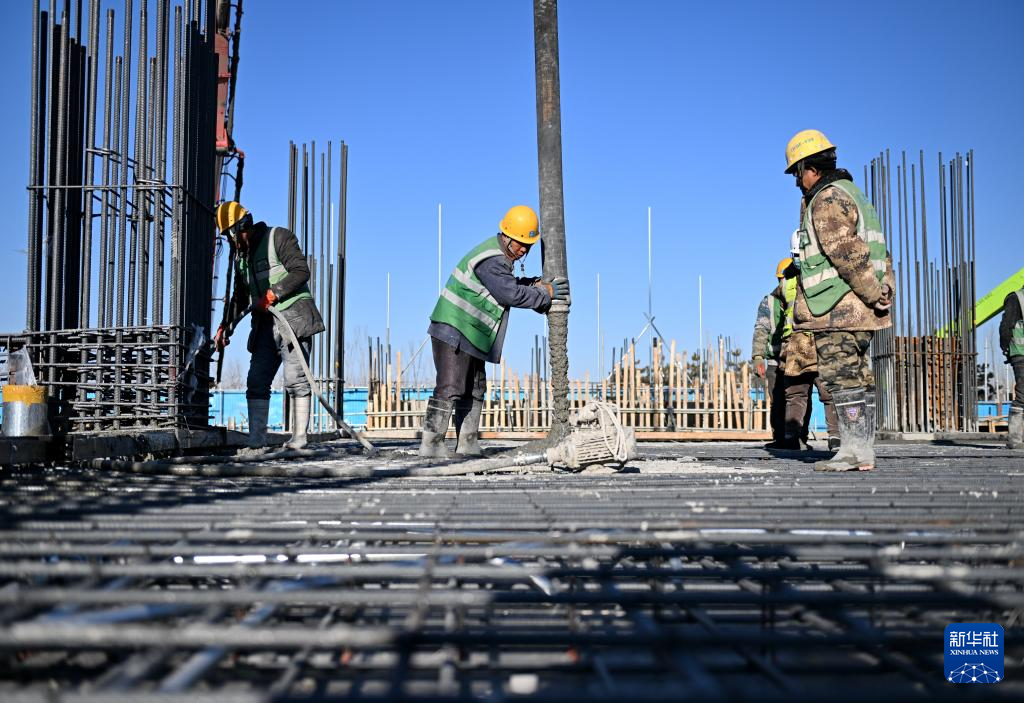 1月9日,中建三局工人在中国矿产资源集团有限公司雄安总部项目建设现场浇筑水泥。