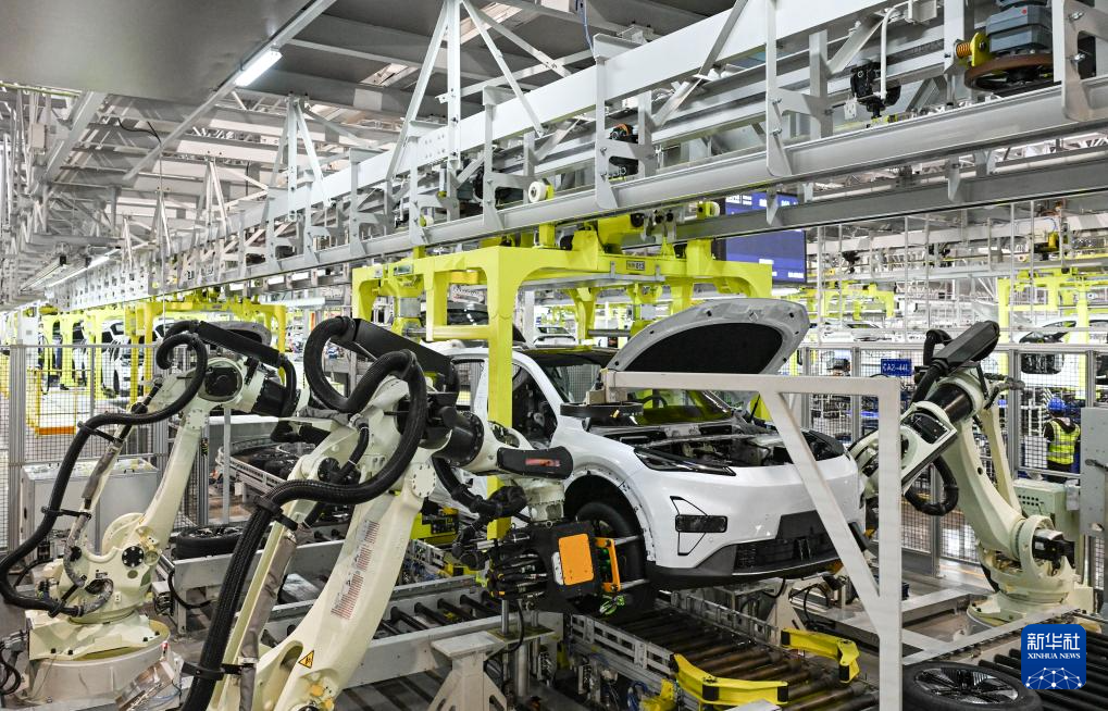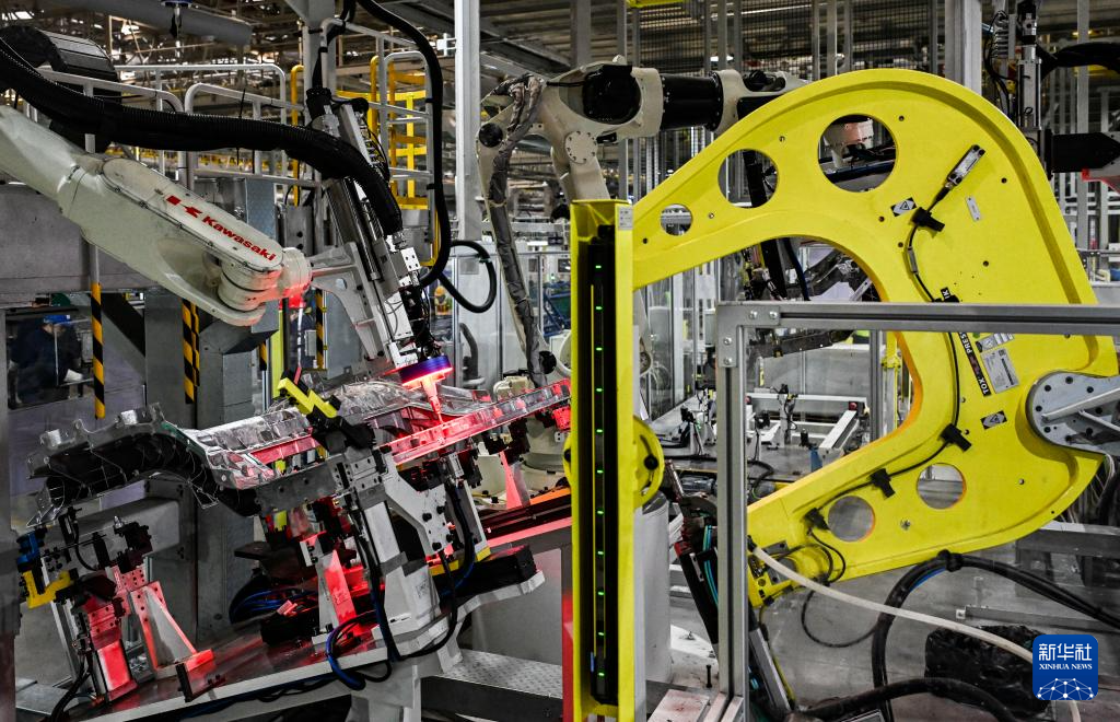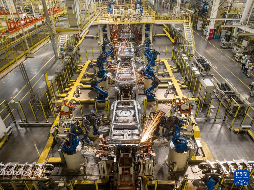 在四川省宜宾市宜宾凯翼汽车有限公司焊装车间,自动机械臂在对新能源车辆进行焊装(2024年3月22日摄)。四川省宜宾市是成渝地区双城经济圈的重要组成部分之一。