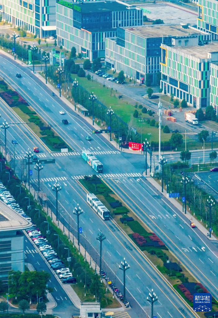 2025年1月9日,两列智轨电车行驶在四川省宜宾市(无人机照片)。四川省宜宾市是成渝地区双城经济圈的重要组成部分之一。