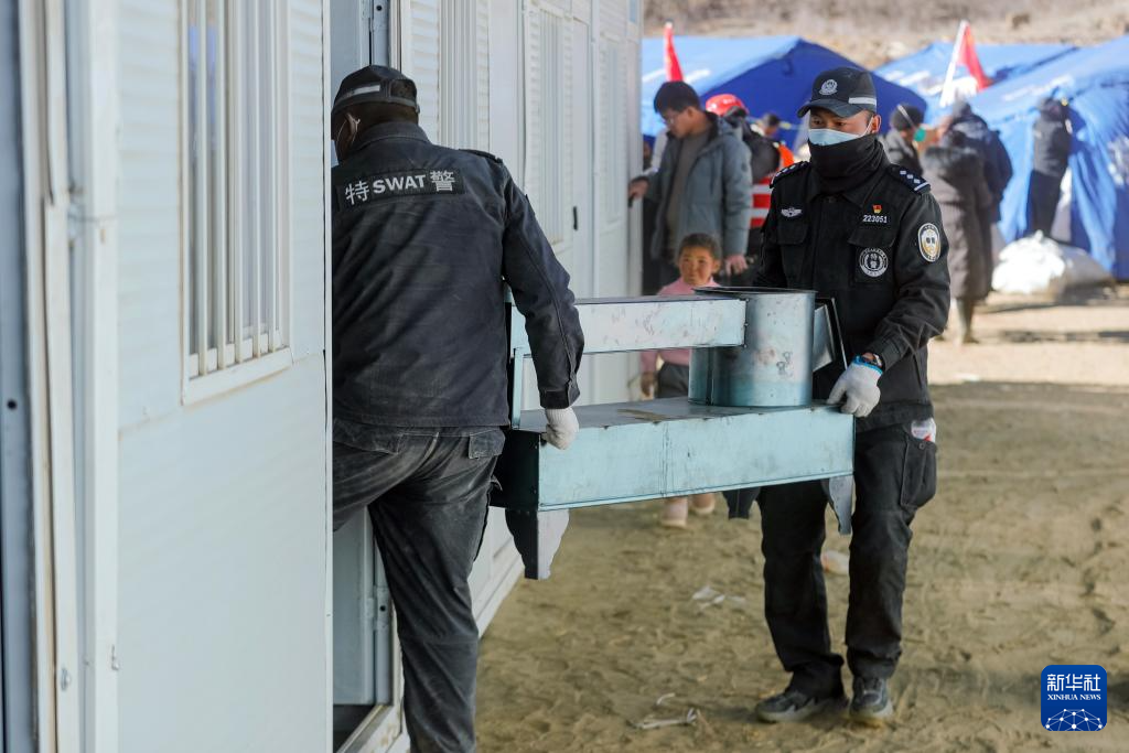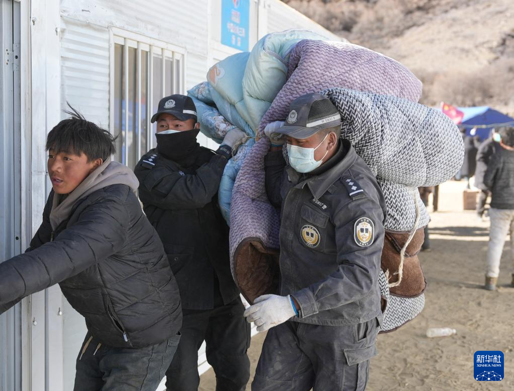 1月10日,在定日县长所乡古荣村,警察帮助受灾群众将物品从帐篷搬至板房。