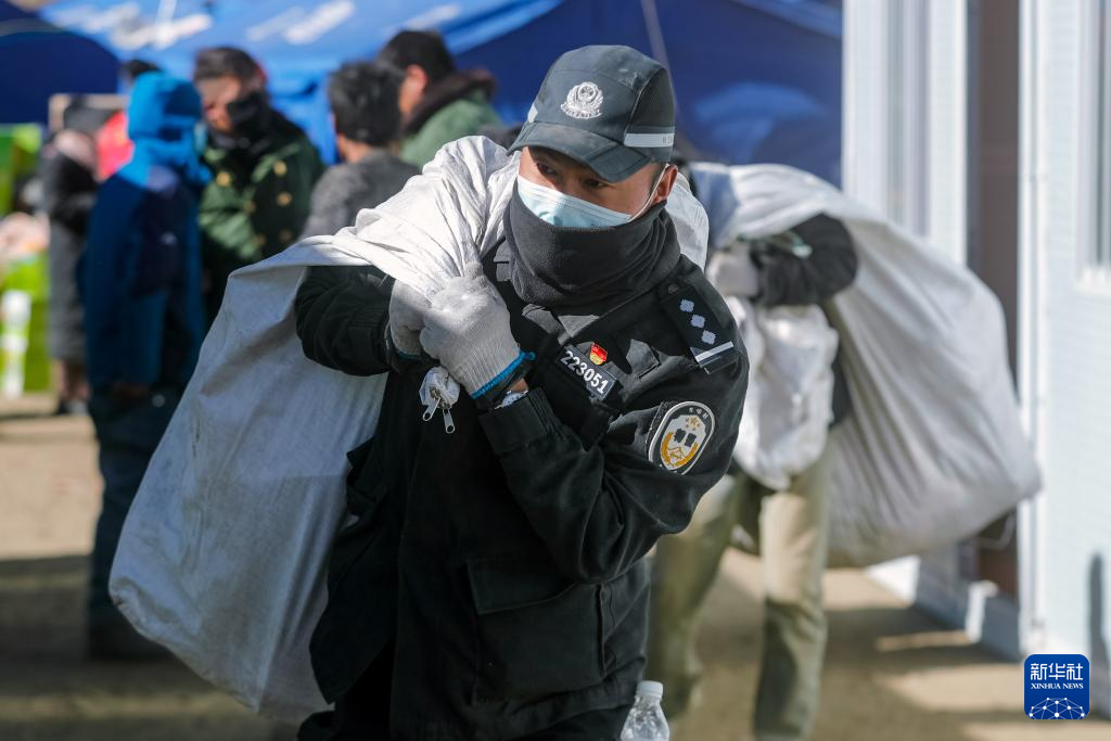 1月10日,在定日县民族团结广场,一名警察搬运将要运往受灾群众安置点的物资。