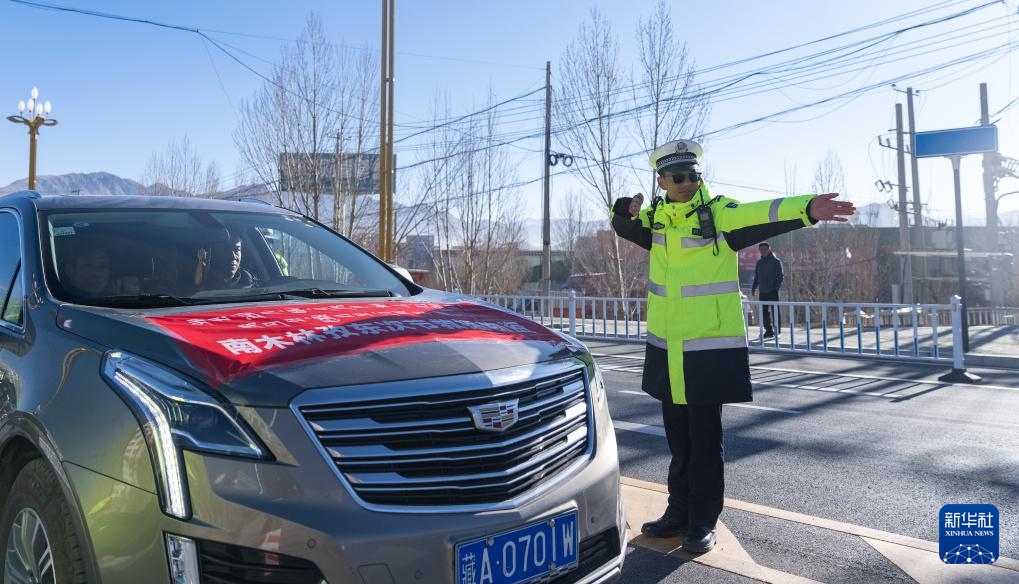 1月10日,在日喀则市区,交警加措在指挥交通,让完成救灾物资运输任务的救援车辆顺利出城。