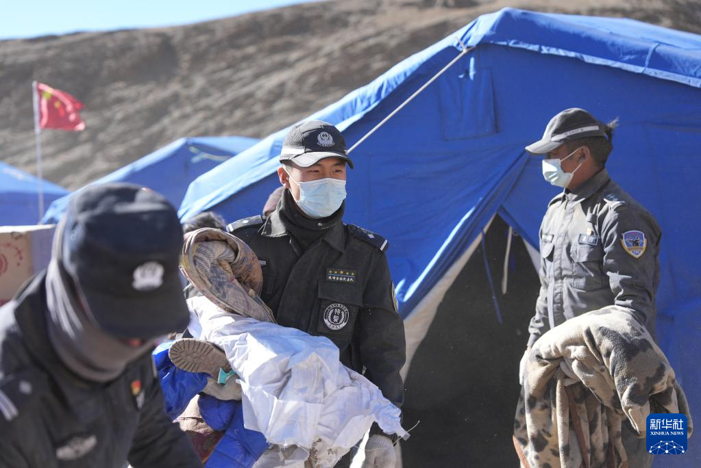 1月10日,在定日县长所乡古荣村,警察帮助搬入板房的受灾群众收帐篷。
