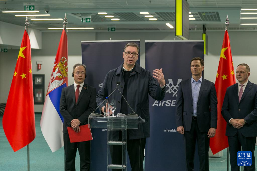 1月10日,在塞尔维亚首都贝尔格莱德的尼古拉·特斯拉机场,塞尔维亚总统武契奇(左二)在塞尔维亚航空公司贝尔格莱德-上海首航仪式上讲话。