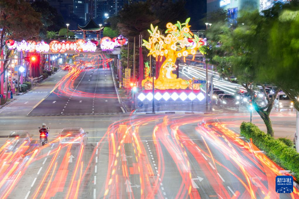 这是1月8日在新加坡牛车水拍摄的农历新年灯饰(长时间曝光照片)。