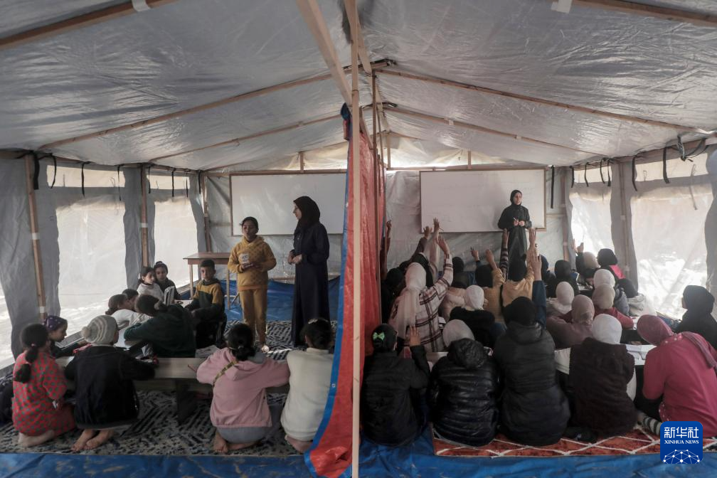 1月6日,学生们在加沙地带中部代尔拜拉赫的一处临时庇护所上课。