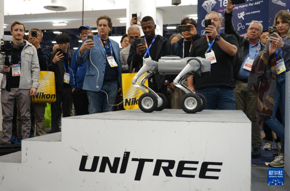1月8日,在美国拉斯维加斯,人们在中国企业宇树科技的展区观看机器狗展示。