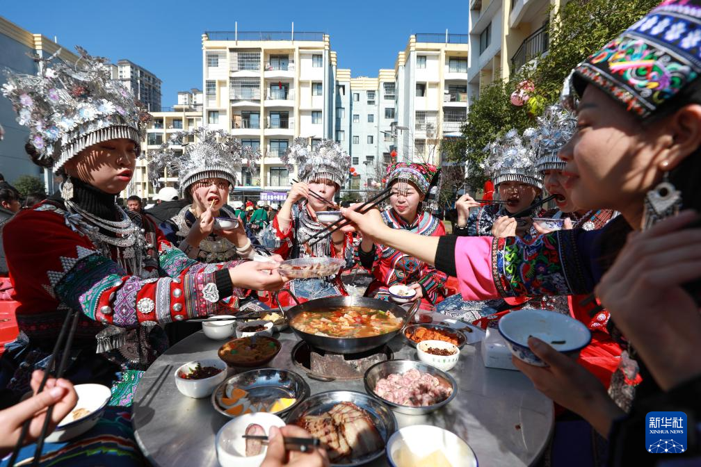 当日,贵州省黔南布依族苗族自治州都匀市小围寨街道思源社区群众欢聚一堂,一起跳竹竿舞、芦笙舞,观看舞龙、舞狮表演,参与打糍粑、趣味游戏等活动,一起吃团圆宴,共迎幸福年。