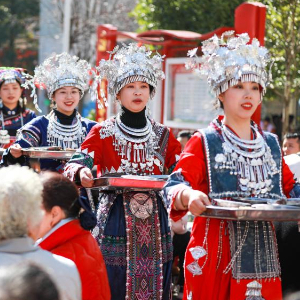 1月12日,在贵州省黔南布依族苗族自治州都匀市小围寨街道思源社区,穿着民族服饰的工作人员为参与活动的群众上菜。