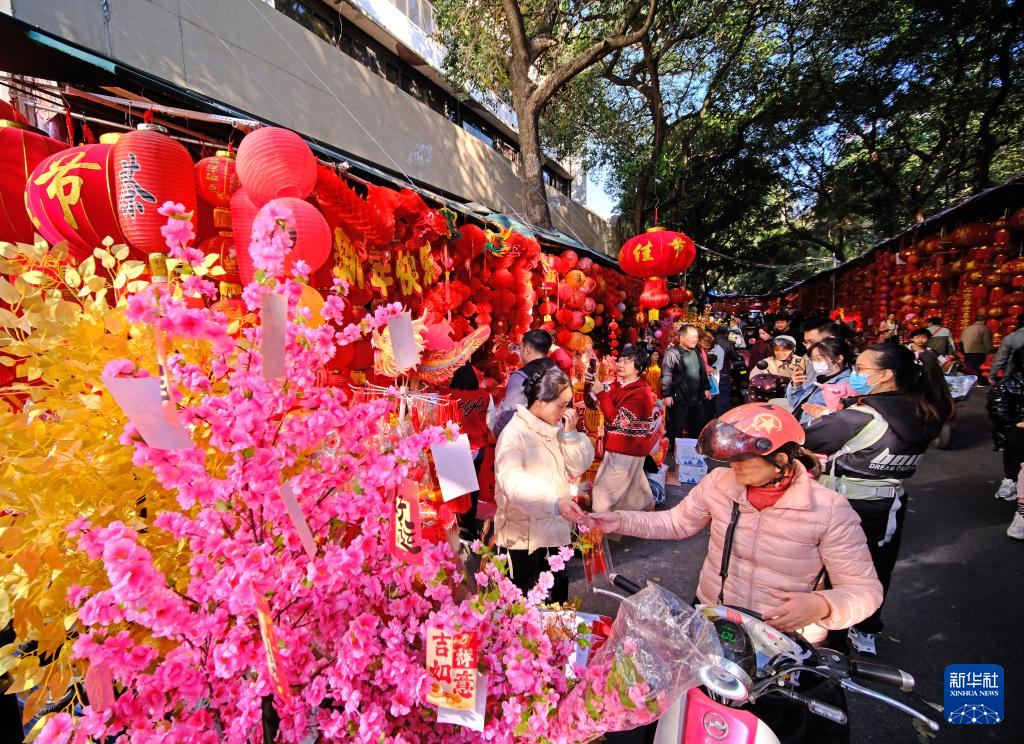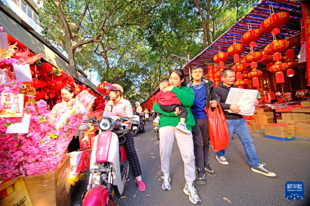 随着春节的临近,广西南宁市交易场附近的新春饰品摊位生意日益红火,众多市民前来采购春联、窗花等新春饰品。