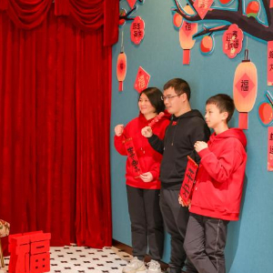 1月12日,市民在展览现场的“团团圆圆照相馆”拍全家福。