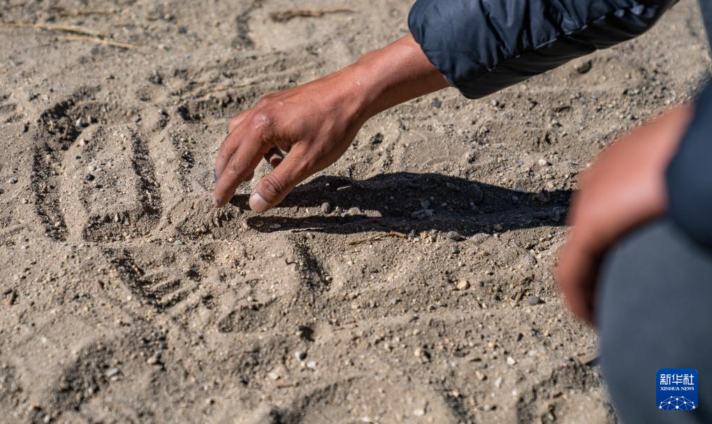 在定结县郭加乡乃村集中安置点,米玛次仁在沙地上用手指画安置点新规划图(1月11日摄)。
