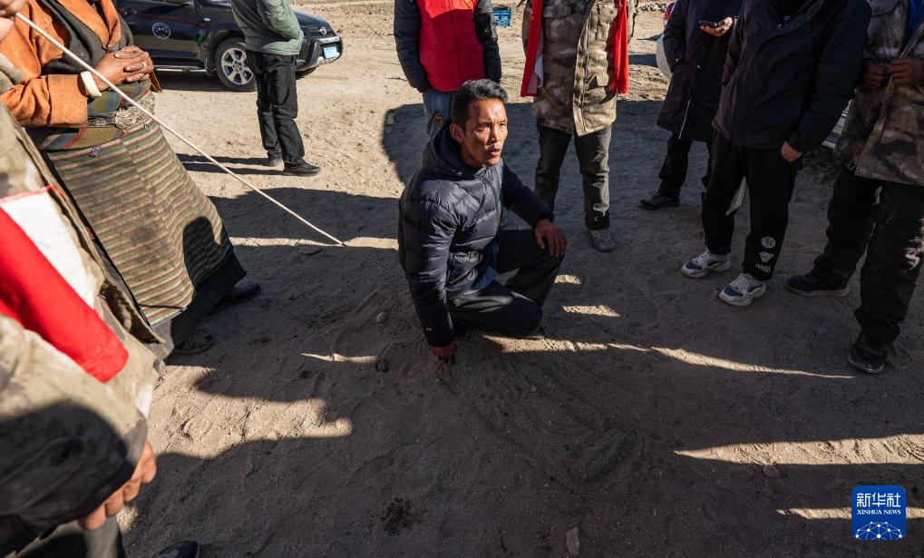 11日早晨,在郭加乡乃村集中安置点,10多名村民围在帐篷前一起讨论。记者走近一看,一个皮肤黝黑的小伙子,眉头紧锁,蹲坐在人群中,用手指在沙地上画图。他是郭加乡乡长米玛次仁。