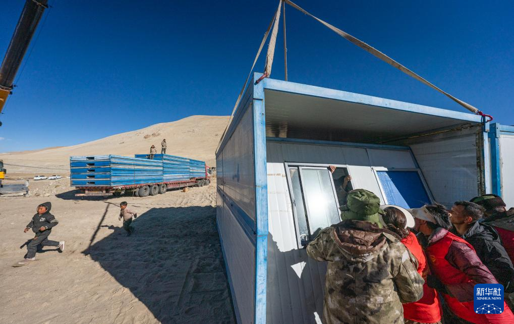 当日下午,装有板房的半挂车和吊车开进安置点。一阵忙碌过后,20间板房整齐地排列在帐篷前。村民们也开始紧锣密鼓地搬家。
