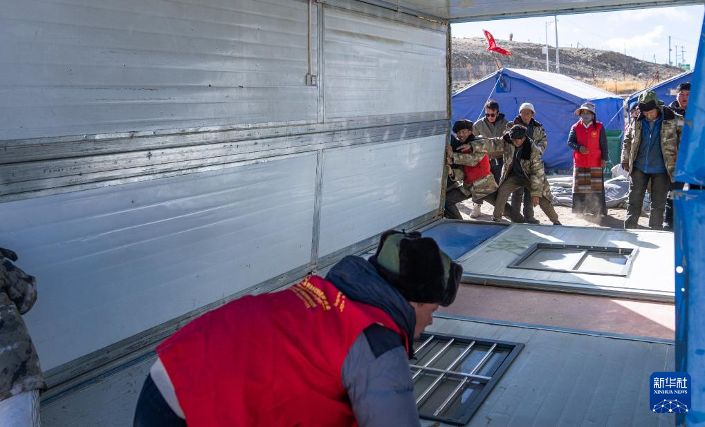 在定结县郭加乡乃村集中安置点,村民和志愿者搭建活动板房(1月11日摄)。