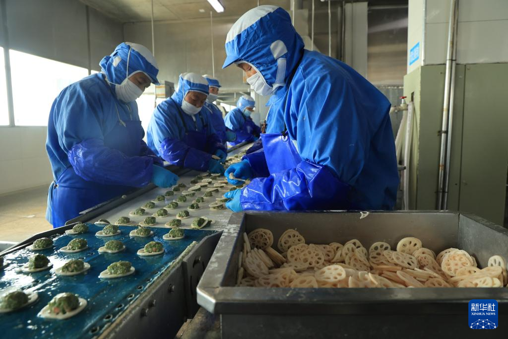 1月12日,在江苏省扬州市宝应县一食品加工厂,工人们在生产车间制作当地特色美食“藕夹子”。