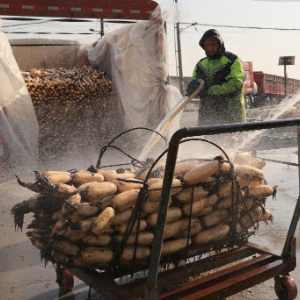 1月12日,藕农们在江苏省扬州市宝应县运河码头清洗莲藕。