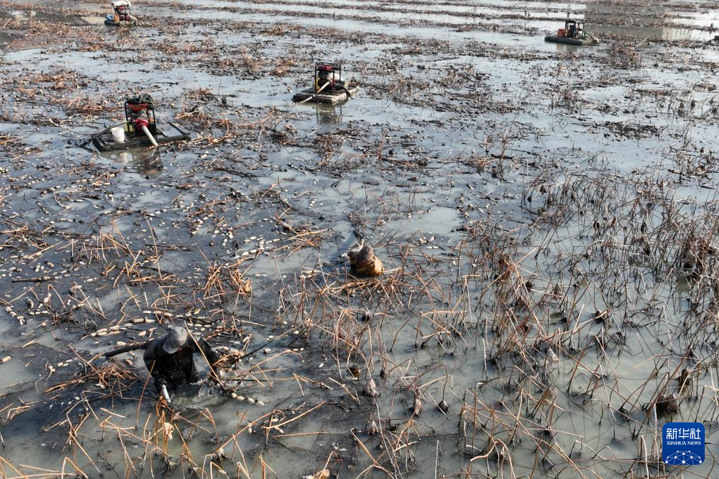 1月12日,在江苏省扬州市宝应县,藕农们在藕塘里采挖莲藕。