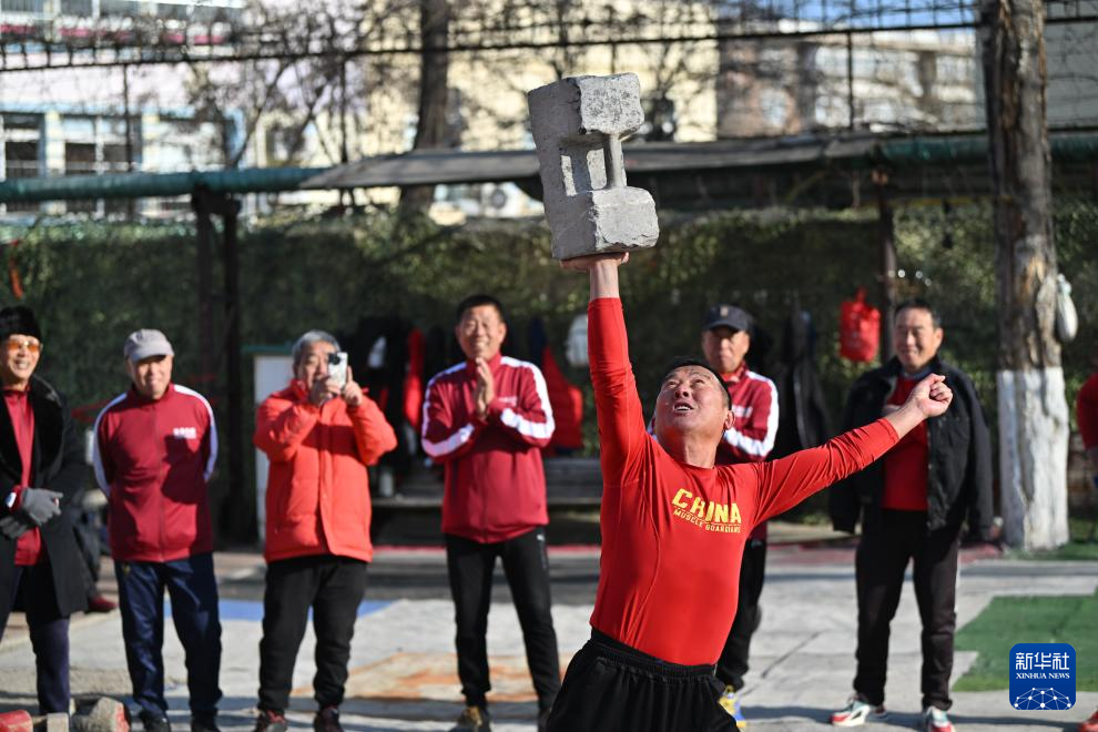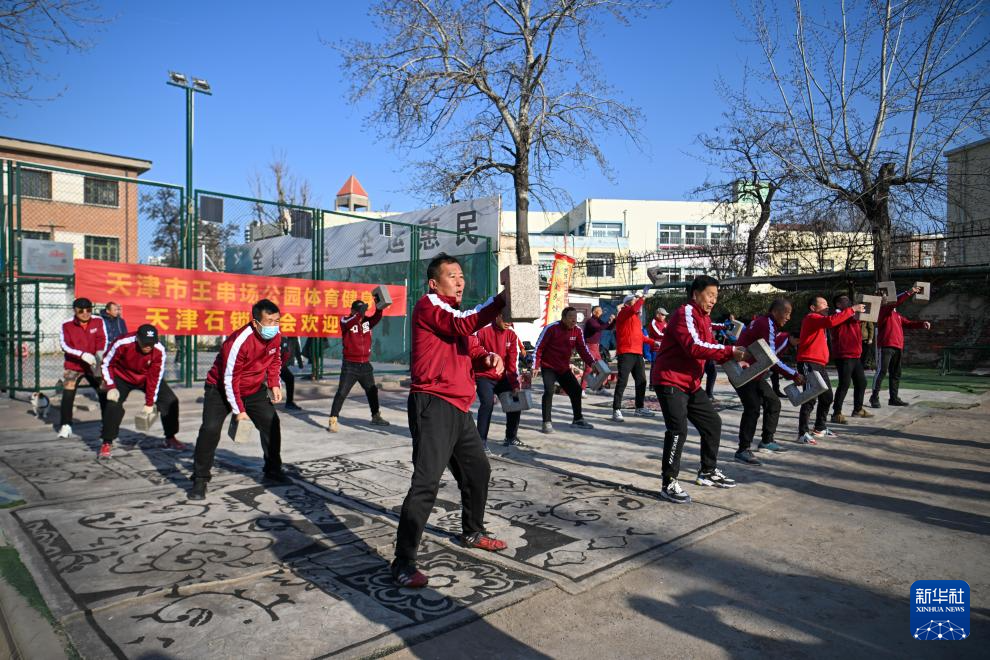 1月12日,在天津王串场体育公园,一位天津大爷展示石锁技艺。