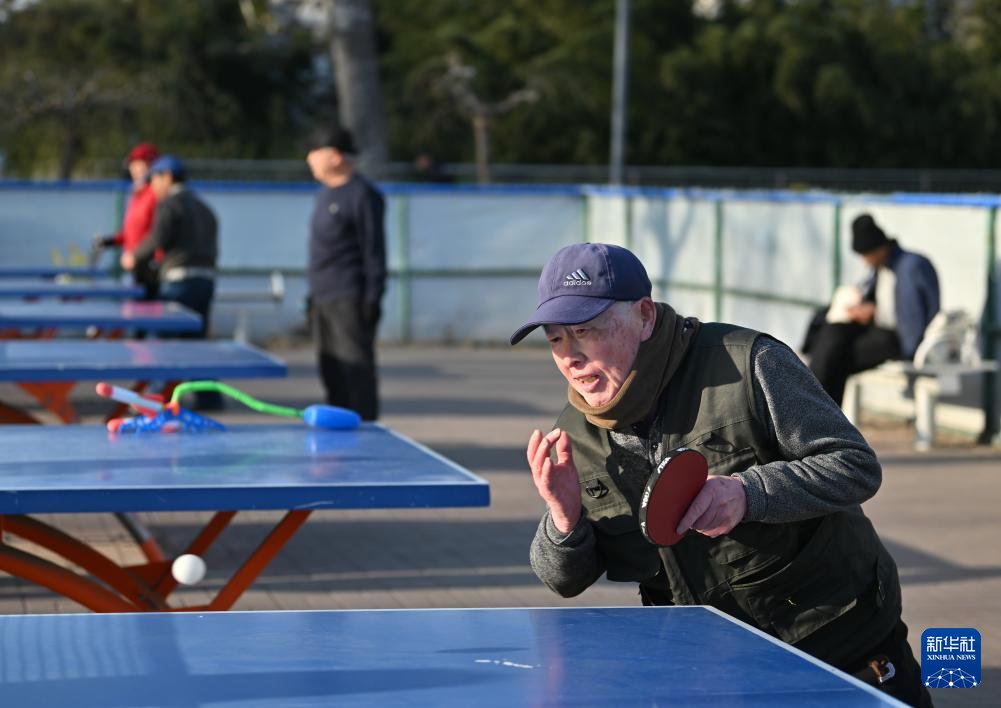 1月12日,在天津王串场体育公园,一位天津大爷打乒乓球。