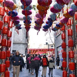 1月13日拍摄的悬挂花灯的北京前门商业区。