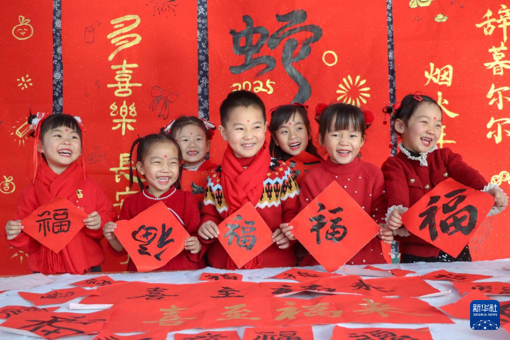 1月13日,在山东省高密市金苹果幼儿园新春游园活动现场,孩子们在晒福字。