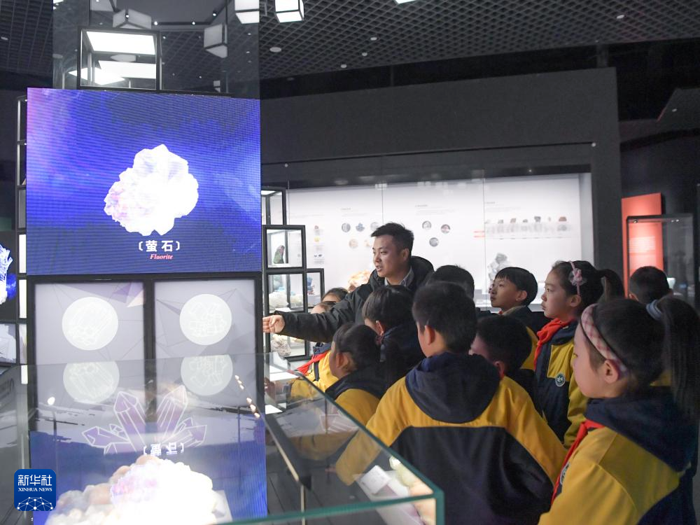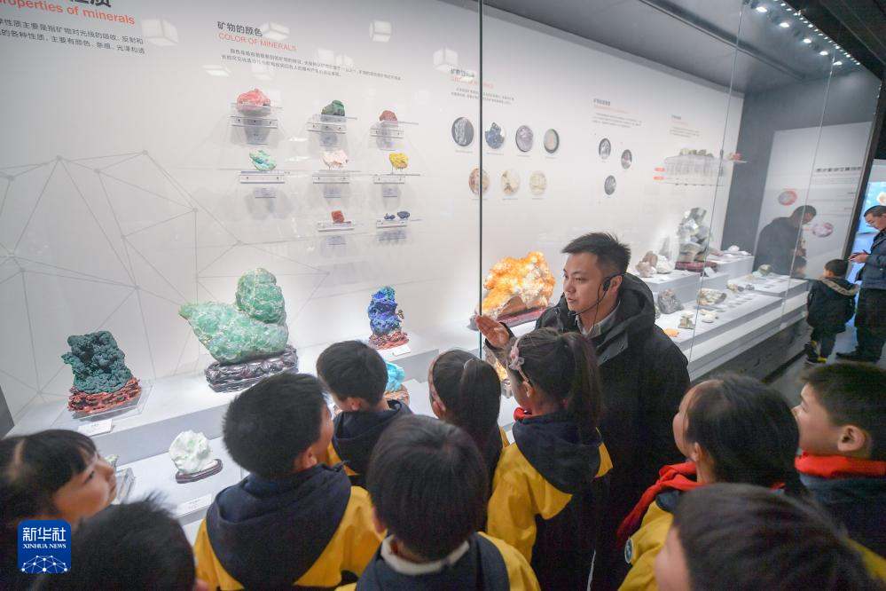 在成都理工大学博物馆,邹灏(后)在给成都理工大学附属小学四年级的学生讲解萤石矿的特点(2025年1月12日摄)。