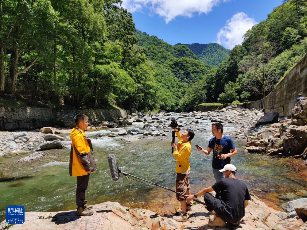 邹灏(左一)在四川巴中光雾山录制科普视频(2020年6月29日摄)。