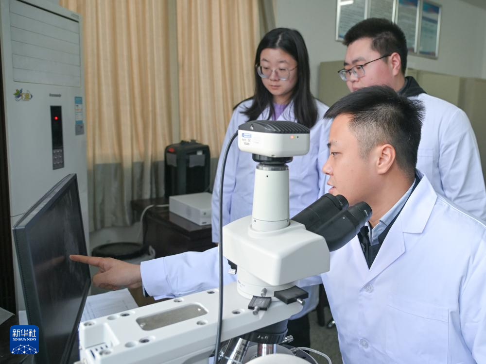 在成都理工大学地球与行星科学学院实验室,邹灏(前)与学生讨论流体包裹体的特征(2024年11月27日摄)。