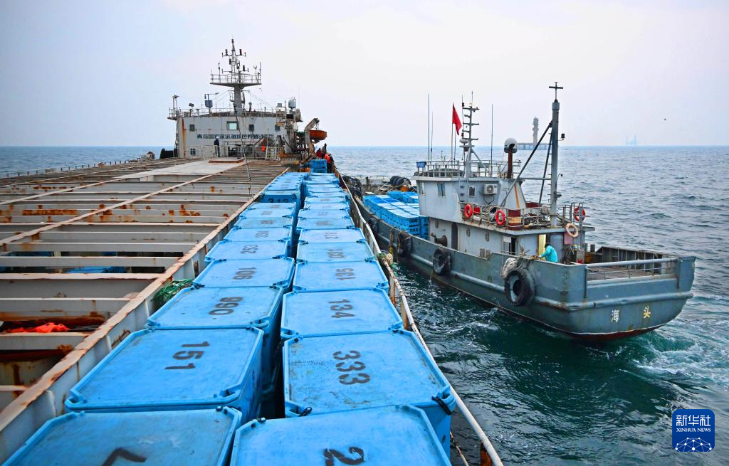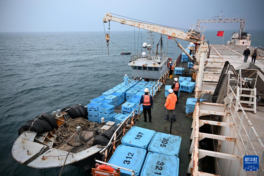 养殖工船(左)抵近“深蓝2号”开展联合收鱼作业(1月12日摄)。