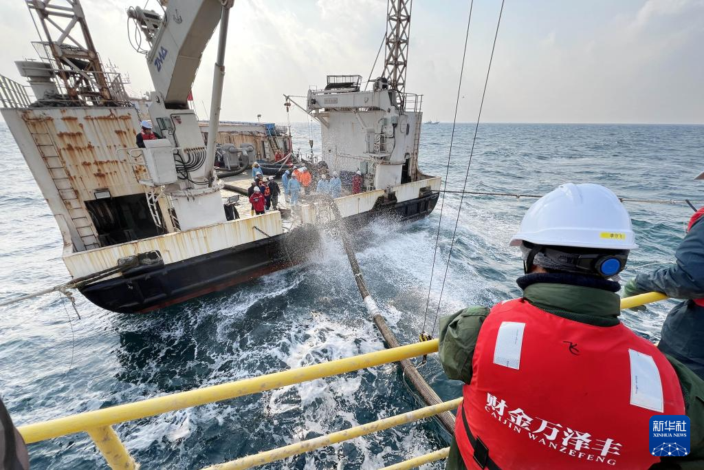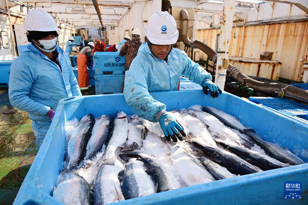 工人在“深蓝2号”上进行拉网作业(1月12日摄)。
