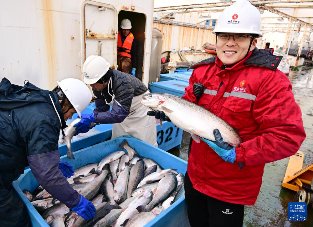 养殖班组长王昌军(前)在展示收获的三文鱼(1月12日摄)。