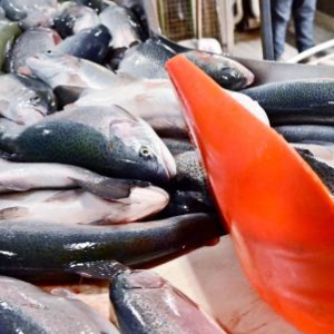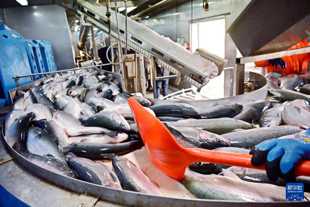 养殖工船上的自动化系统输送三文鱼(1月12日摄)。