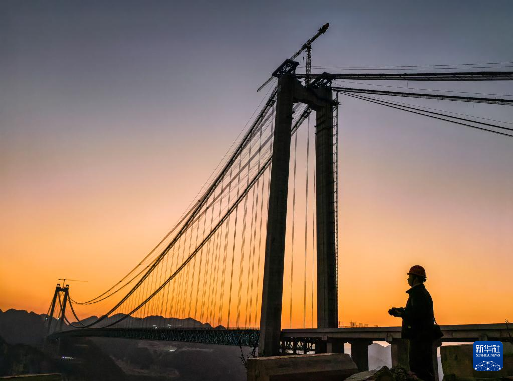 1月14日,工人在为吊装贵州六安高速公路花江峡谷大桥最后一个节段钢桁梁做准备。
