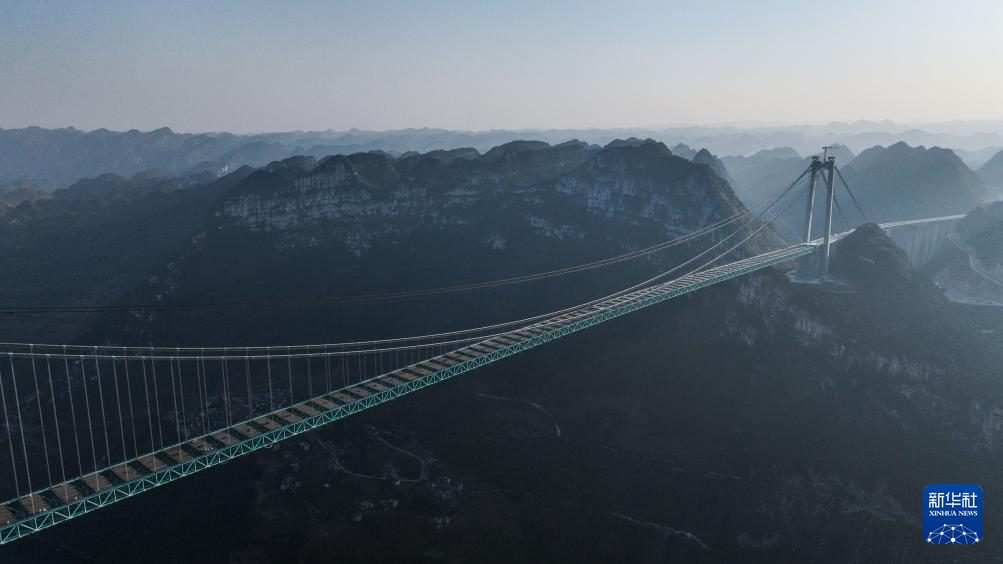 这是1月14日拍摄的贵州六安高速公路花江峡谷大桥(无人机全景照片)。