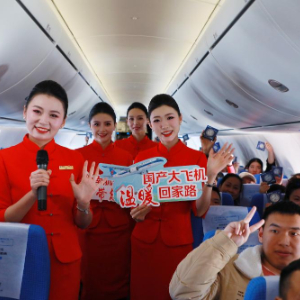 1月14日,在南航CZ8233广州—成都天府航班上,空乘人员开展C919国产大飞机投入春运主题活动。