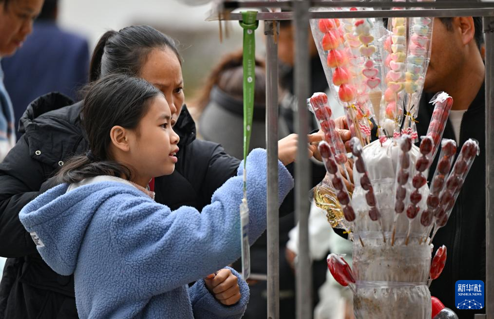 1月15日,家长带着孩子在集市上选购糖葫芦。