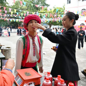 1月15日,一名男子在集市上品尝本地黎族酿制的山兰酒。