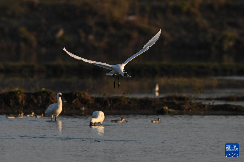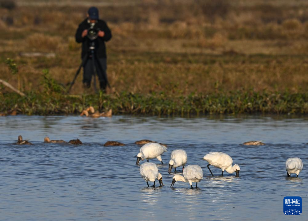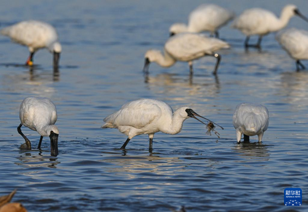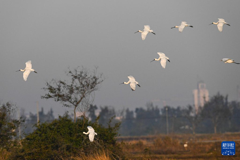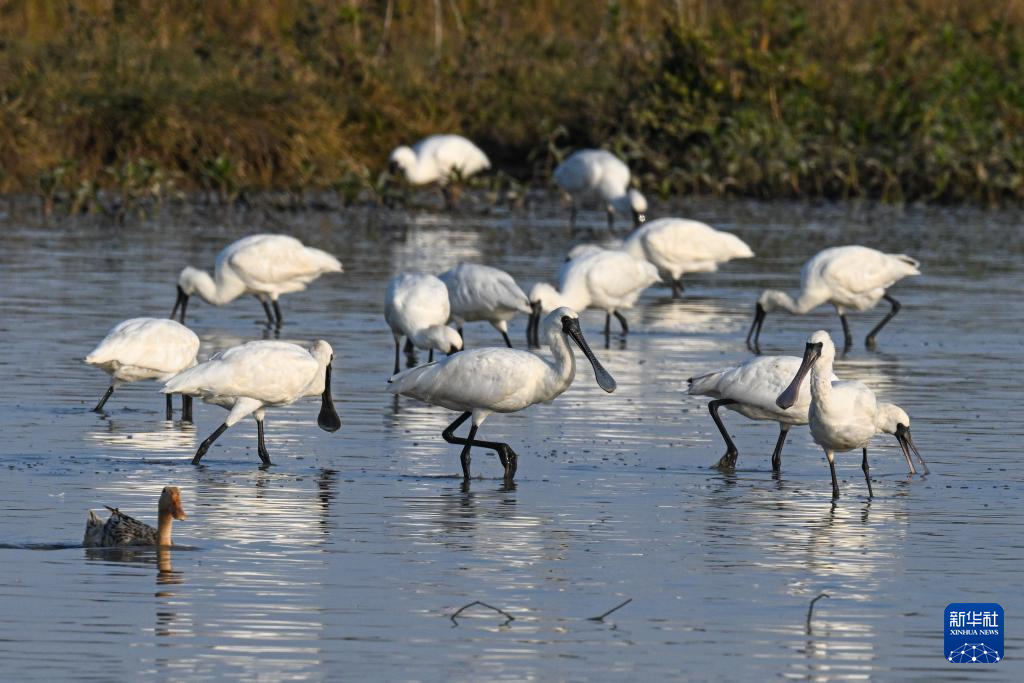 近日,不少黑脸琵鹭在位于海南儋州的儋州湾湿地觅食、飞翔,成为冬日一道独特风景。黑脸琵鹭是世界珍稀濒危鸟类、国家一级重点保护野生动物。近年来,当地通过退塘还湿、栽种红树林、巡护鸟类等方式,不断加强滩涂湿地修复和鸟类保护,湿地生物多样性日益丰富。