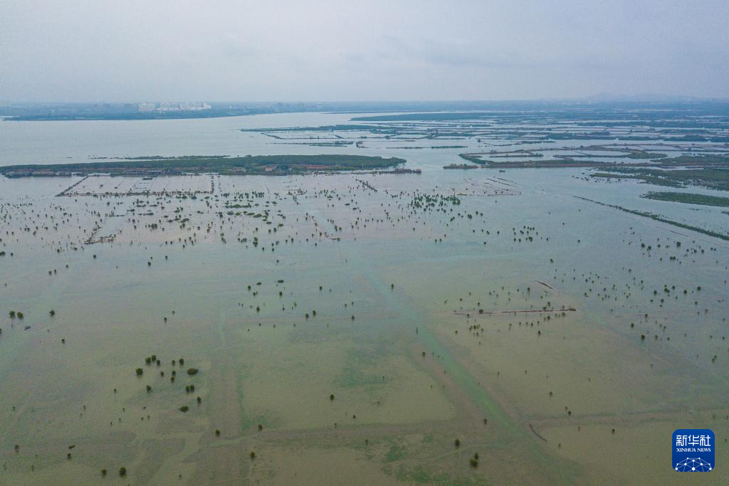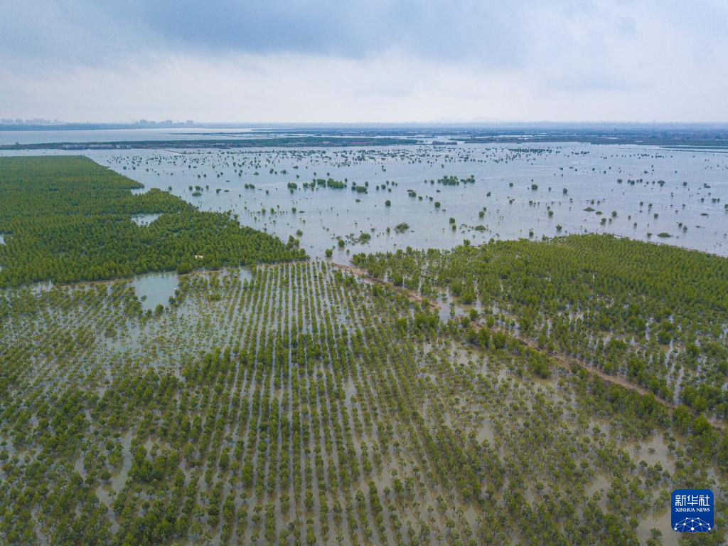 1月15日在海南儋州拍摄的儋州湾一处修复后的湿地,湿地内有大量人工栽种的红树林(无人机照片)。