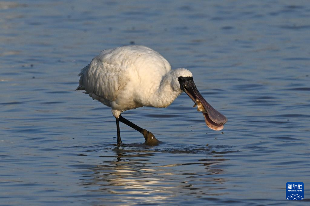 1月13日,黑脸琵鹭在儋州湾湿地觅食。