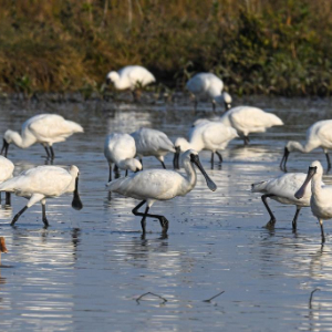 1月13日,一群黑脸琵鹭在儋州湾湿地觅食。