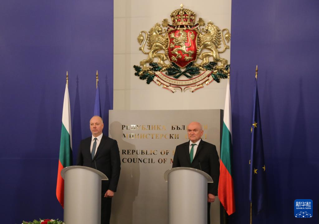 1月16日,在保加利亚索非亚,罗森·热利亚兹科夫(左)与看守内阁总理迪米特尔·格拉夫切夫(右)在新一届内阁名单获批后共同发表讲话。