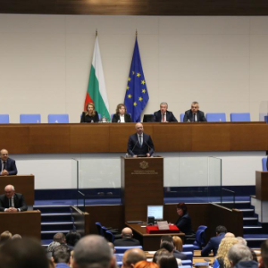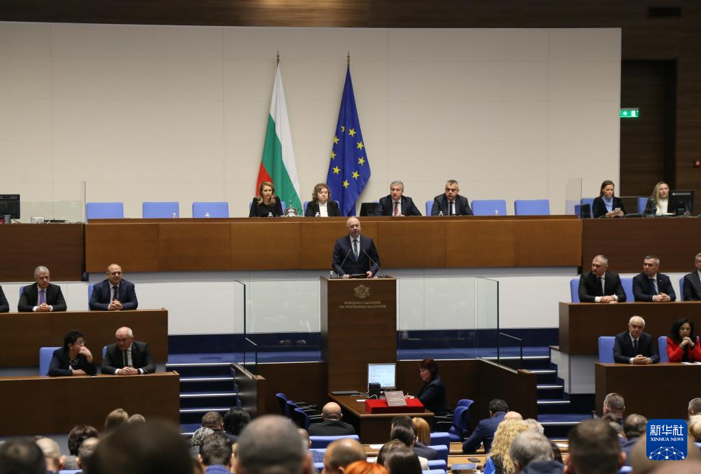 1月16日,在保加利亚索非亚,罗森·热利亚兹科夫(中)在保加利亚国民议会讲话。