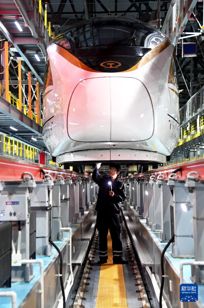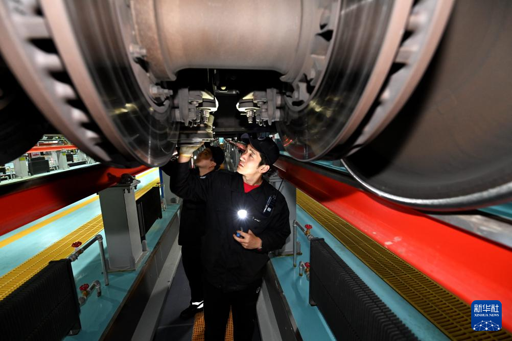 1月15日晚,中国铁路北京局集团有限公司天津动车客车段廊坊动车运用所检修库内灯火通明,机械师们连夜进行检查、测试、维修工作,保障动车运行安全。