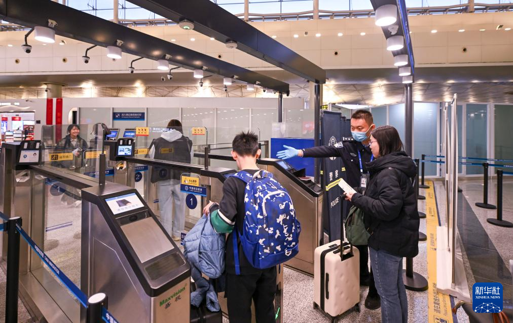 1月16日,旅客在天津滨海国际机场T1航站楼出境检查大厅使用自助设备办理出境查验手续。
