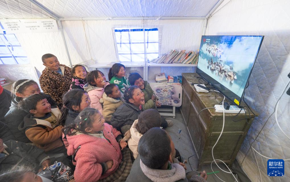 在定日县长所乡嘎布村,孩子们在看《西游记》(1月14日摄)。
