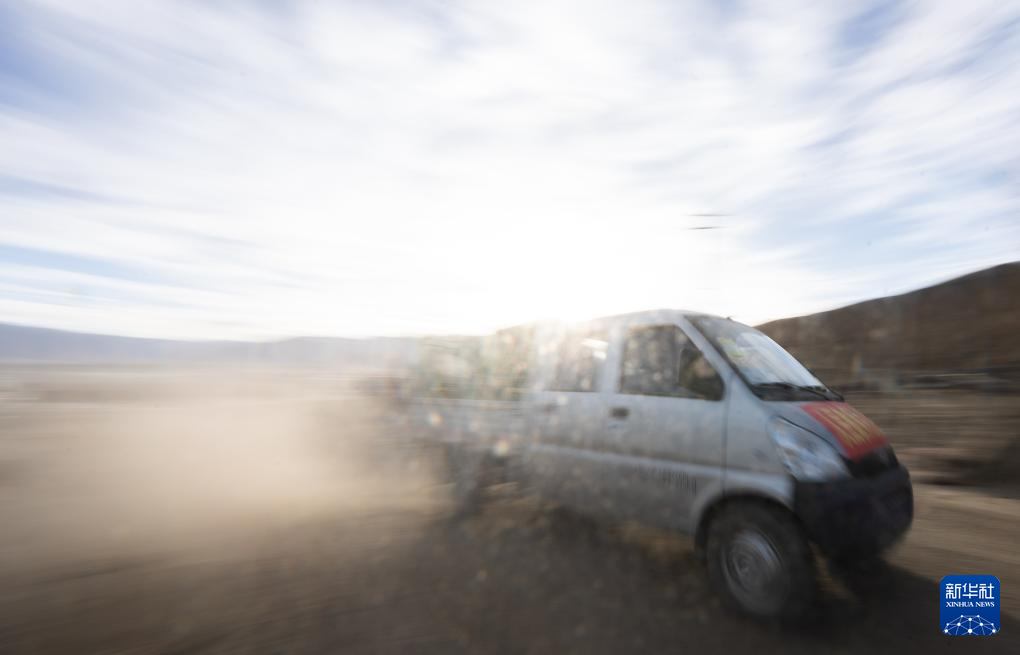 一辆装载救灾物资的汽车向定日县长所乡古荣村方向行驶(1月15日摄)。