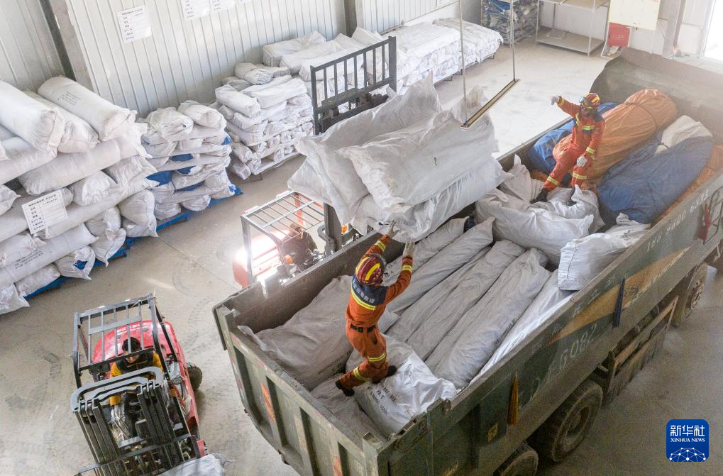 在定日县应急储备仓库,西藏自治区应急管理系统救灾物资保障队队员在搬运抗震救灾物资(1月15日摄,无人机照片)。